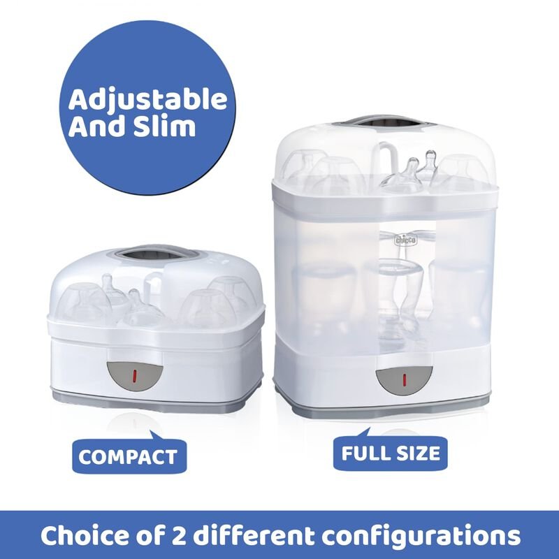 SterilNatural 2 in 1 Chicco is the modular electric steam sterilizer easy to use offering two configurations. This electric steam sterilizer can adjust the size of the sterilizer according to the objects to be sterilized: Full Size and compact. SterilNatural 2 in 1 sterilizes in just 5 minutes and kills 99.9% of harmful germ, with natural steam and no chemicals included. It is also very easy to accommodate since it is small in size.