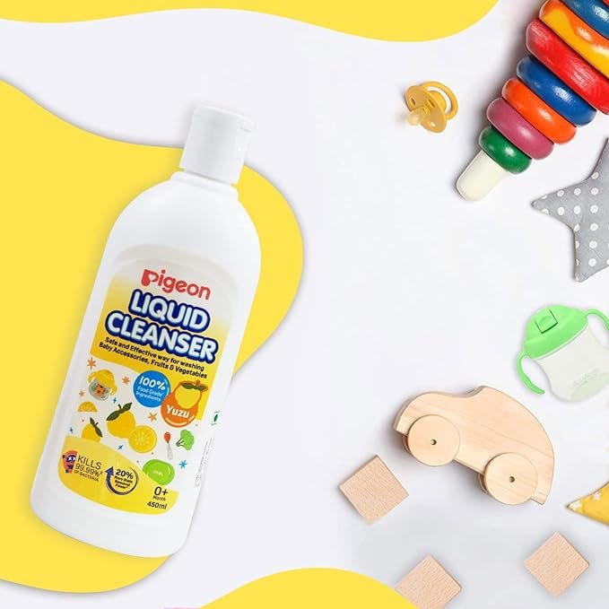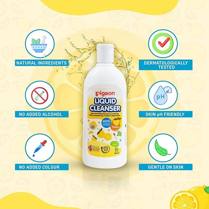 Pigeon liquid cleanser yuzu citrus fruits fragrance 450 mL ( 0+ M ) safe and effective way to wash baby bottles and accessories as well as fruits and vegetables. Made with 100% Food Grade ingredients, easy to rinse and kills 99.99% of bacteria.